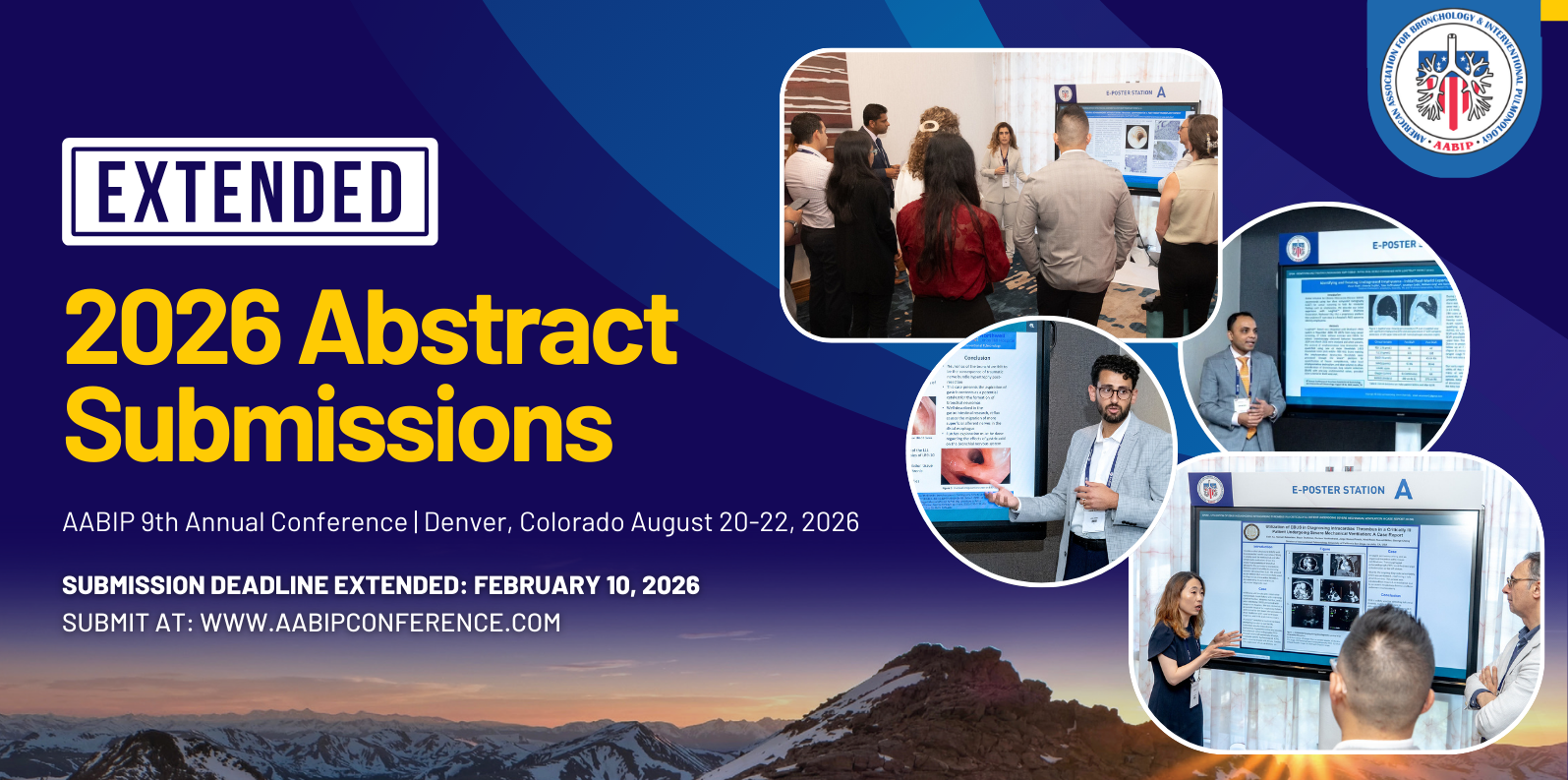 The American Association for Bronchology and Interventional Pulmonology (AABIP) is calling for scientific abstract submission for its annual meeting to be held August 20 to 22, 2026 in Denver, Colorado. The premier conference for interventional pulmonologists, advanced bronchoscopists, pleural experts and other interested health care professionals aims to gather leading clinicians, scientists, and educators to exchange ideas and discuss research on all aspects of Interventional Pulmonology and Advanced Bronchoscopy. It also provides an ideal platform for all participants to present and discuss the latest technologies, research trends, as well as practice innovations to advance the field and better patient care.